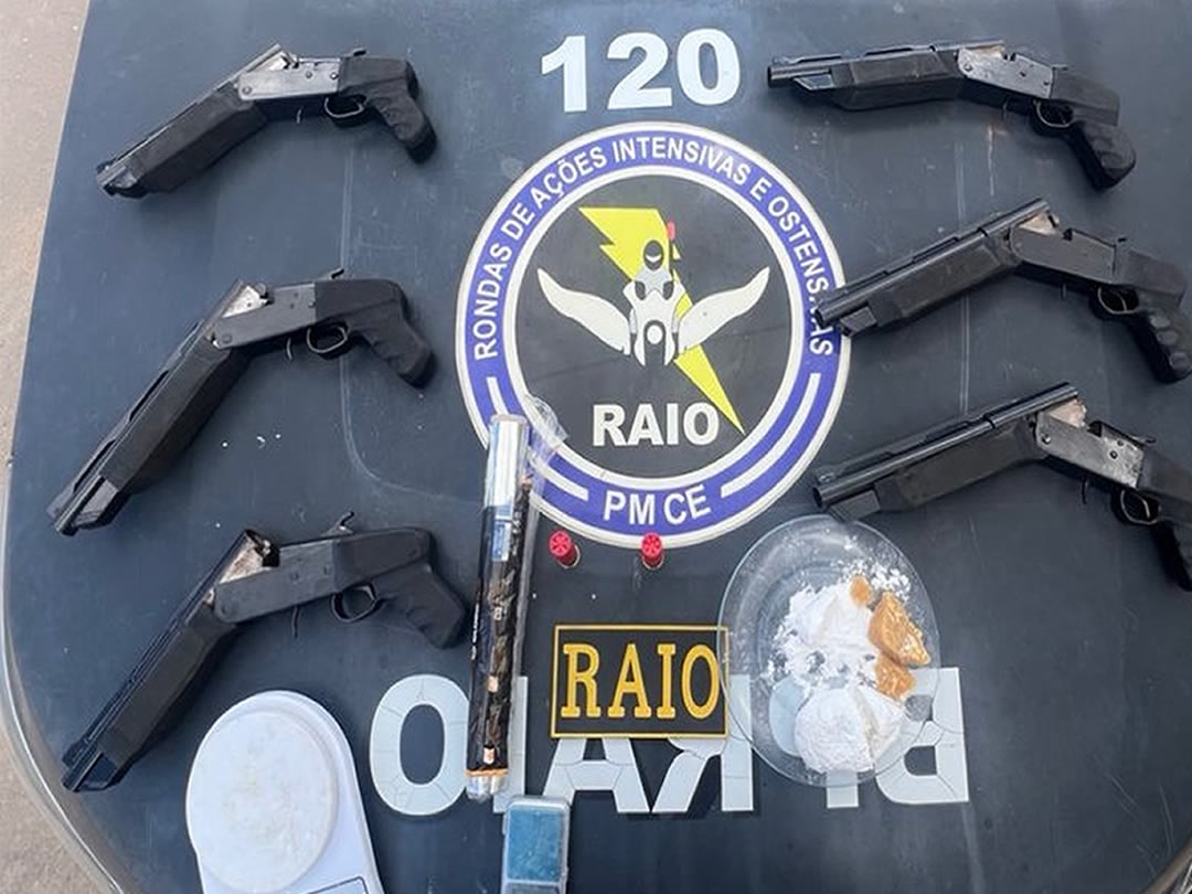 Uma ação da Polícia Militar do Ceará (PMCE) resultou, no último domingo (23), na apreensão de seis armas de fogo e drogas em Juazeiro do Norte. O material ilícito foi encontrado em uma uma casa no bairro Frei Damião e apresentado a Delegacia de Juazeiro do Norte, unidade local da Polícia Civil do Estado do Ceará (PCCE).