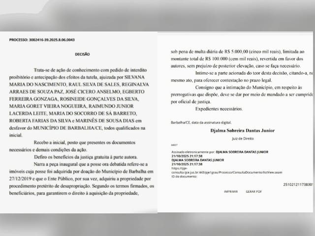 Com a decisão, a Prefeitura de Barbalha fica proibida de realizar qualquer ato que interfira na posse dos moradores, sob pena de multa diária de R$ 5 mil em caso de descumprimento.