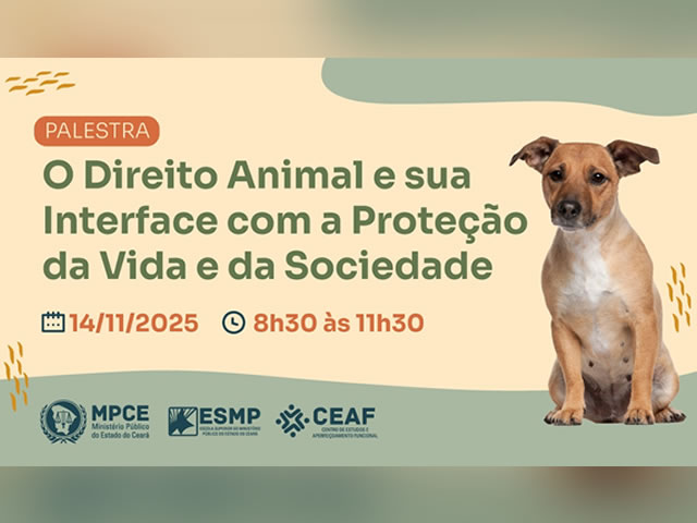 O Ministério Público do Ceará, por meio do 1º Núcleo Regional da Escola Superior em Juazeiro do Norte e do Centro de Estudos e Aperfeiçoamento Funcional (Ceaf), com apoio da ESMP, realizará no dia 14 de novembro, a palestra “O Direito Animal e sua Interface com a Proteção da Vida e da Sociedade”, na sede das Promotorias de Justiça de Juazeiro do Norte. O evento é aberto ao público em geral e tem como objetivo estimular o debate sobre os avanços legislativos, éticos e institucionais relacionados à proteção animal. As inscrições podem ser feitas pelo link: https://cursos.mpce.mp.br. Haverá emissão de certificado de participação.