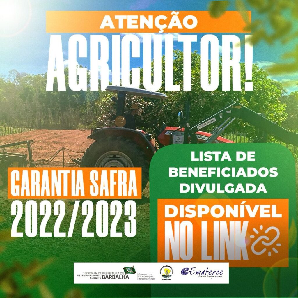 A Secretaria do Desenvolvimento Agrário (SDA) de Barbalha, em parceria com a Superintendência de Desenvolvimento do Nordeste, tem o prazer de anunciar a lista de agricultores familiares beneficiados pelo programa Garantia Safra 2022/2023.